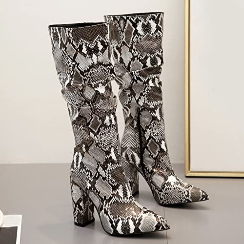 trending ! SHEMEE Women's Colorful Snakeskin Knee High Boot Chunky Block High Heels Snake Print Round Toe Zipper Slouch Shoes