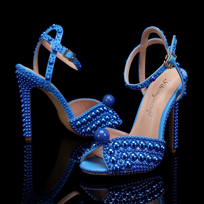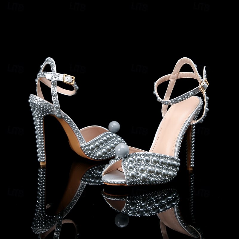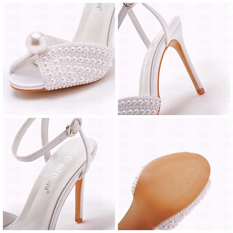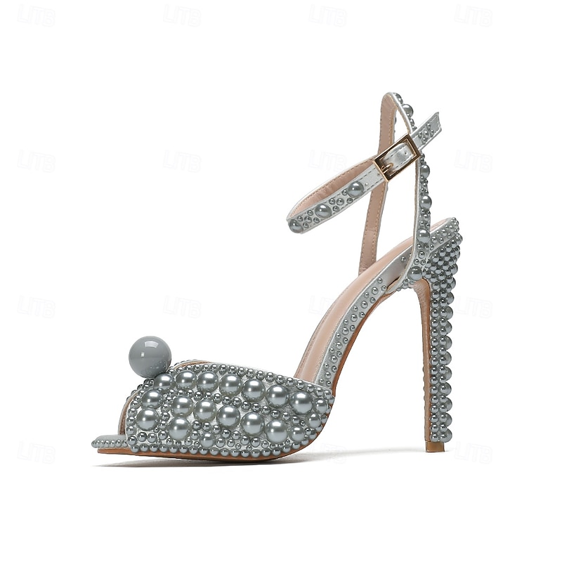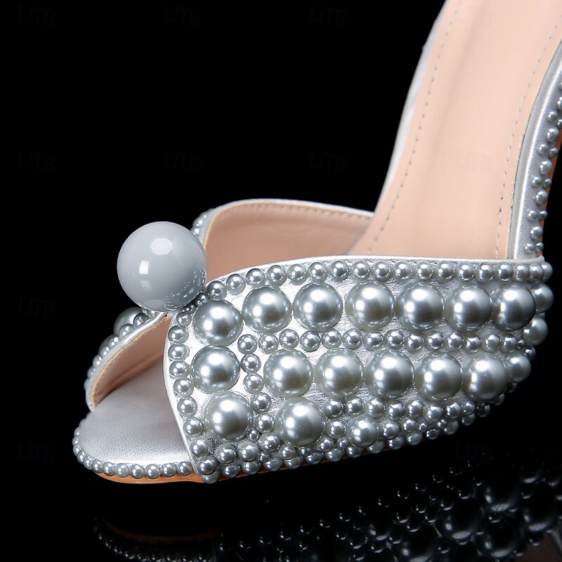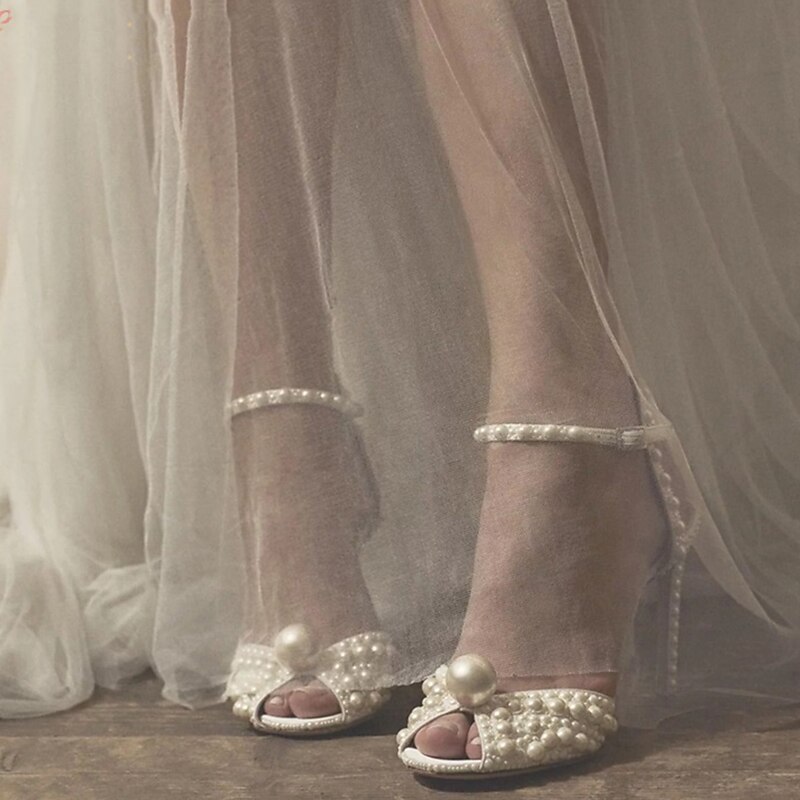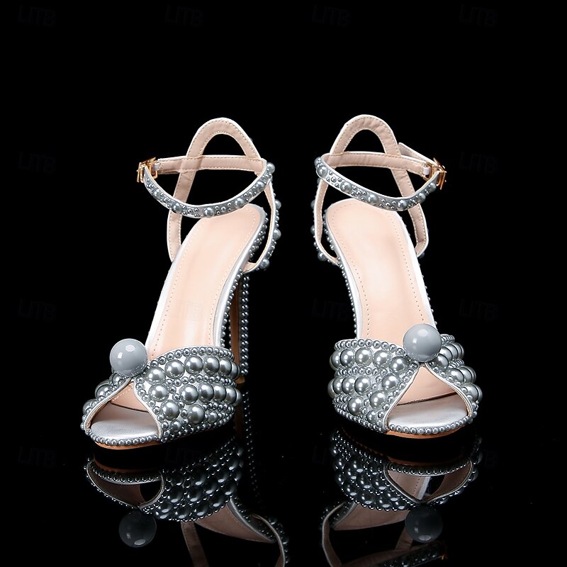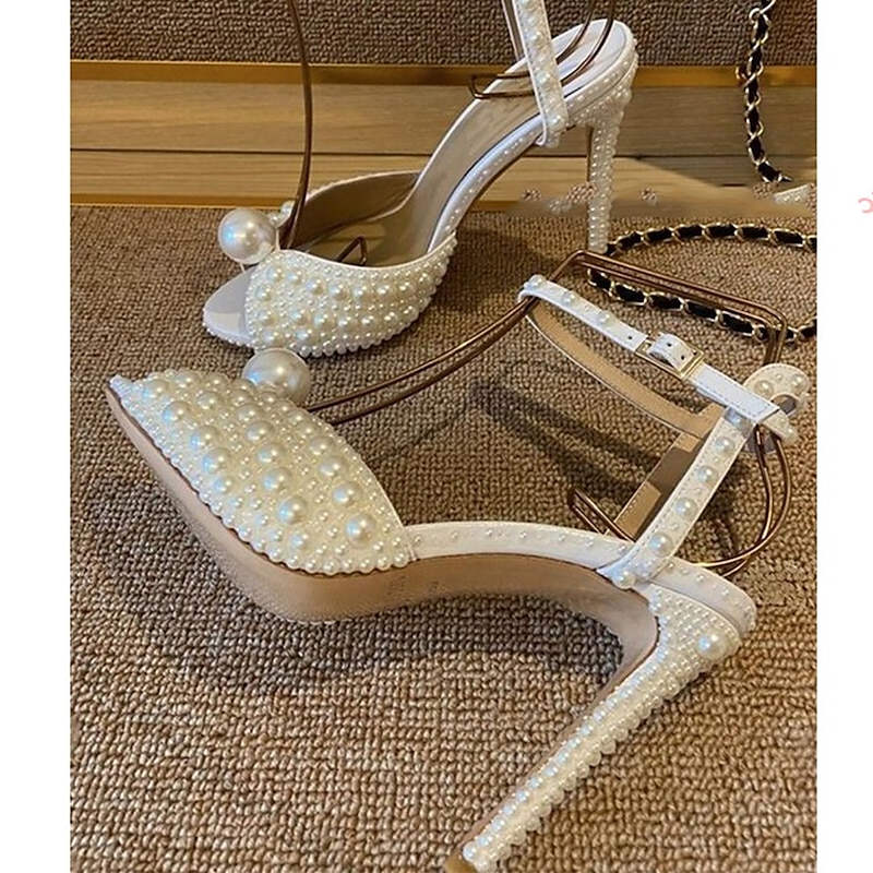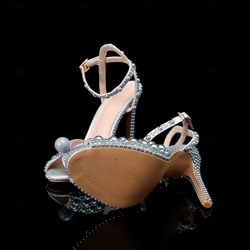 Women's Pearl-Embellished Stiletto Heels - Elegant Bridal Wedding Shoes with Ankle Strap and Open Toe Design