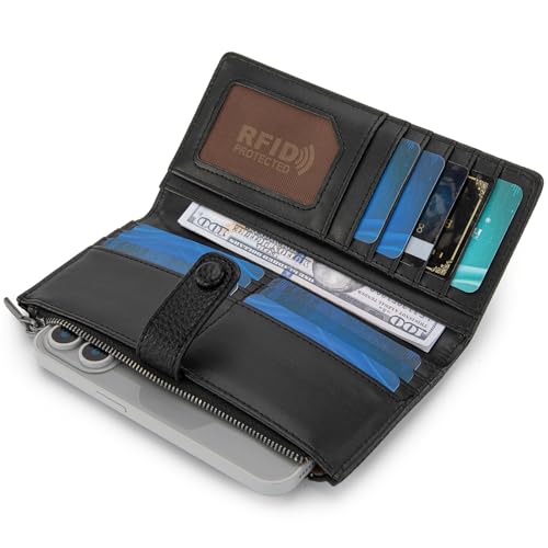Long Wallet Design: 7.7 x 4 x 1, you can carry this women's wallet in hand or put it in a bagFunctional Wallet: With 8 card slots, 5 cash slot, 1 zipper coin pocket, and 2 id window, this Montana west wallet can meet your demand for a daily wallet womenBifold Design: Bifold wallet women with slim folding buckle closure and a zippered coin pocket on the back, easy to put in coinsRFID Blocking Wallet: This RFID wallet women is equipped with advanced RFID technology that protects you from electronic pickpocketing by blocking unauthorized scans from RFID scanners and readersVegan Leather: Long wallet is made of vegan leather, simple and fashionable, womens wallet can be easily matched for many occasions, such as birthdays, anniversaries, Christmas, Mother's Day, etc Perfect for everyday use. supreme materials and excellent craftsmanship ensure long-lasting durability.