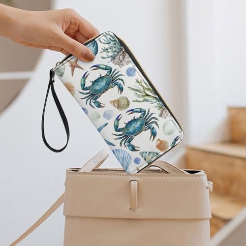 Women's Cute Decor Long PU Zipper Wallet, Travel Purse Fashion Design, Huge Storage Capacity Purse With Rope Under Sea Ocean Starfish Shell Coral Crab Watercolor